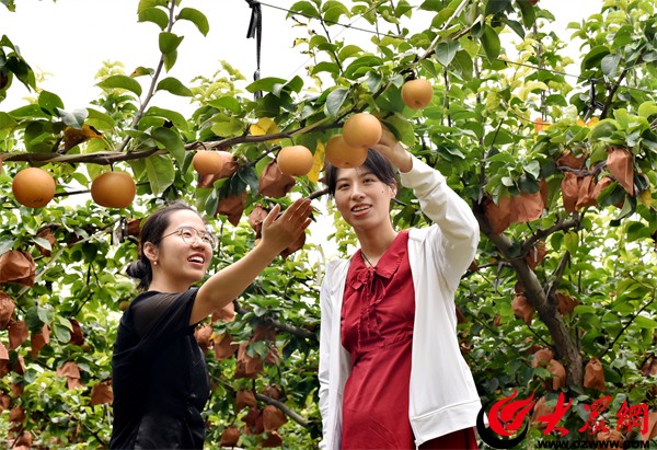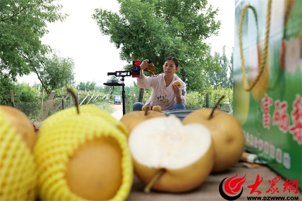 果农穿梭在树间的同时,网络直播电商郭玲玲正在解说:“家人们,咱们的秋月梨长势很好,皮薄核小,甜蜜多汁,坏果包赔。”说着,她切了一块拿在手中一攒,汁水飞溅。