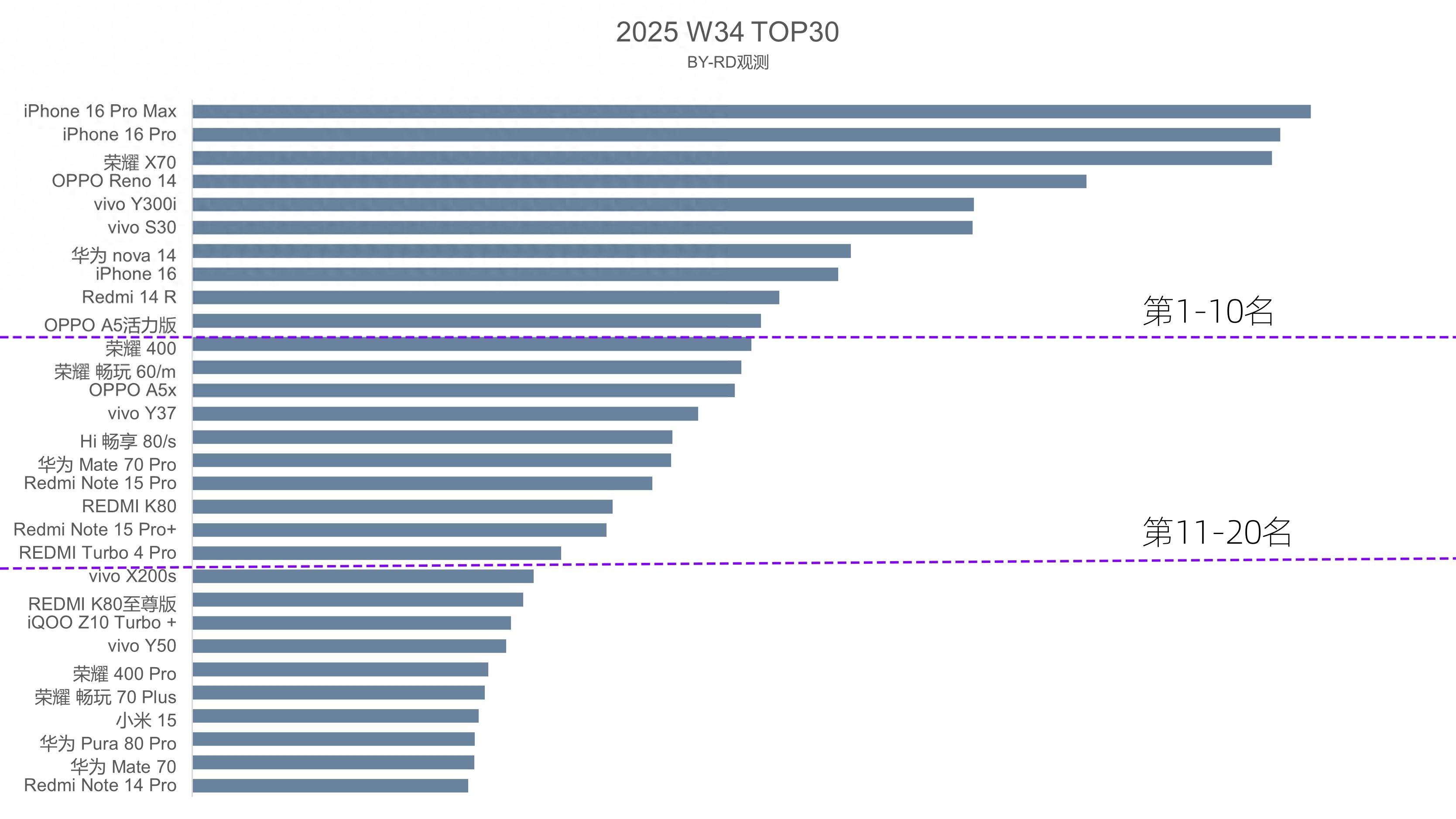 今天继续分享W34(8.18-8.24)国内智能手机畅销榜:iPhone17跌到了榜单第八名,荣耀X70持续发力,让iPhone16 Pro不再遥遥...