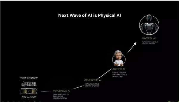 随后NVIDIA明确指出,继感知AI、生成式AI和智能体AI之后,下一个万亿级美元的市场将是物理AI,即能够理解物理定律并与现实世界交互的智能实体系统。