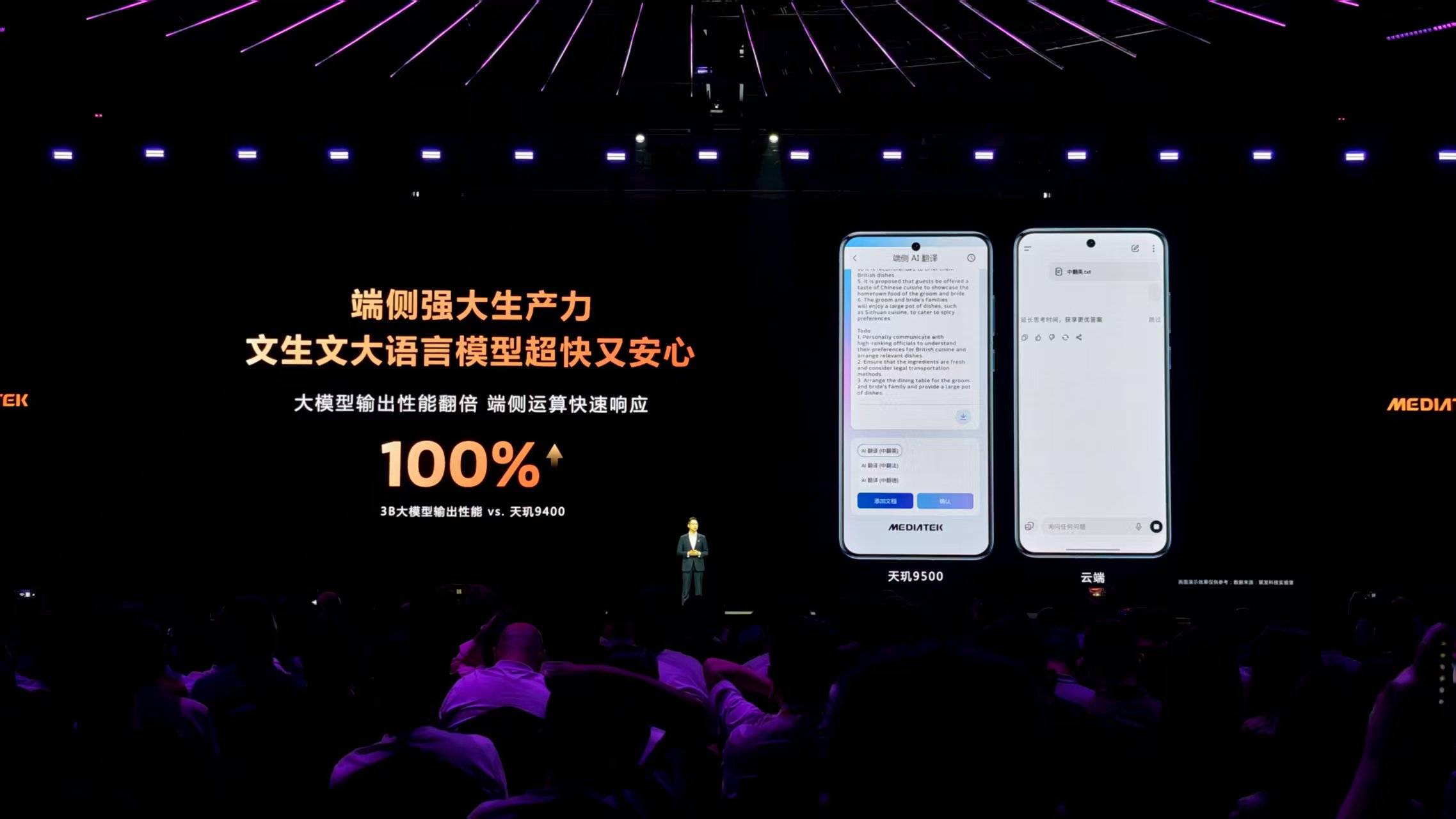 比如在现场我们看到,基于双NPU架构带来的性能和能效提升,天玑9500加持的手机终端可以实现端侧长文本处理,文本支持长度增长了3倍,最高支持128K文本输入。