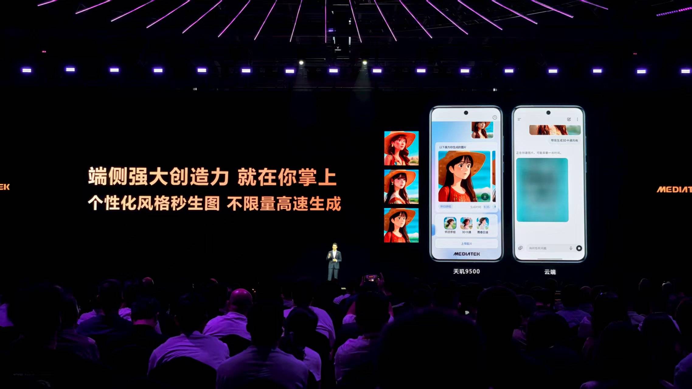 此外,天玑9500终端可以无限量快速生成个性化风格图片,比如我们可以将相册中的一张人物照片发给AI,让它迅速生成动漫风、卡通风等不同风格的图片,其生成速度甚至只有7-8秒,并且是相对于云端生成数量的限制,端侧生成依靠本地算力,生成完全不限量。