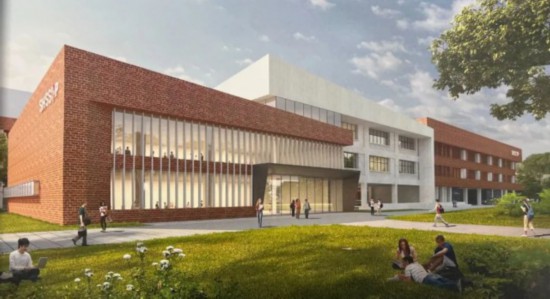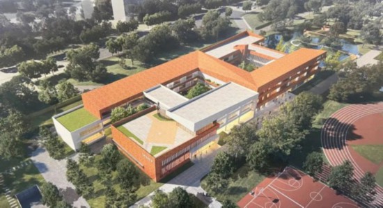 从设计图上可以看出,新建立的教学楼以砖红与白为主色调,内部结构错落,植被环绕。